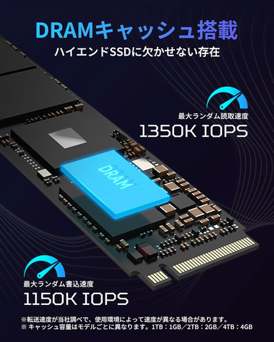 GM7000に搭載されたDRAMキャッシュは、データマップなどの頻繁にアクセスするデータを、DRAMへ一時的に格納することで、DRAMレスのSSDより処理速度が大幅に向上。また、NANDへの頻繁な書き込みも不要となるため耐久性もDRAMレスのSSDより高くなっている。