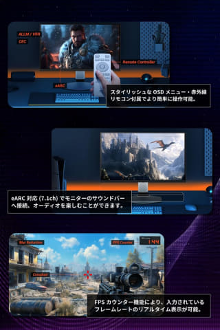 本商品は、量子ドット有機ELパネル搭載のゲーミングモニター。4K UHDの高解像度、240Hzのリフレッシュレート、0.03msの応答速度で、オープンワールドやストーリー重視のゲームでも圧倒的没入感と滑らかな映像体験を実現する。