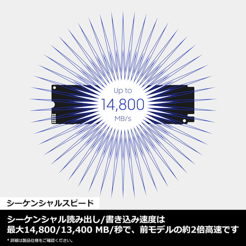 「9100 PRO」は、PCIe 5.0に対応したM.2 SSD。最大転送速度はモデルにより異なり最大14,800MB/s、最大書き込み速度は13,400MB/sを誇り、PCIe 4.0対応の前モデル「990 PRO」よりも約2倍高速になっている。