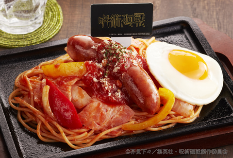 赤がキャラクターカラーの脹相(ちょうそう)をイメージした赤いナポリタンに、フランクフルト、目玉焼きをトッピング。途中でタバスコをかけて、味変も楽しめる。