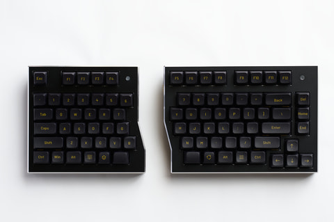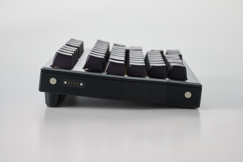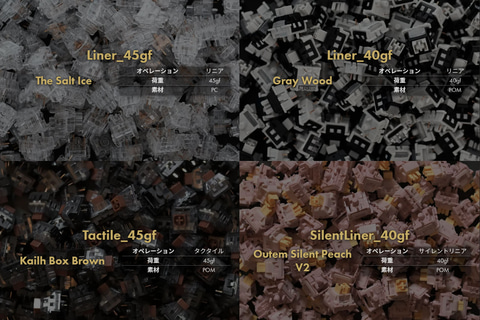 分割式のため左右ユニットを肩幅に合わせて配置可能で、デスクレイアウトの自由度を確保するという。充電時は側面ポートと左右のマグネットで結合することで、1本のケーブルで同時に充電できる。購入時に4種のキースイッチを選択可能で、購入後もはんだ付けなしでスイッチを交換できる。キースイッチは「The Salt Ice」(リニア、45gf)、「Gray Wood」(リニア、40gf)、「Kailh Box Brown」(タクタイル、45gf)、「Outem Silent Peach V2」(サイレントリニア、40gf)となっている。