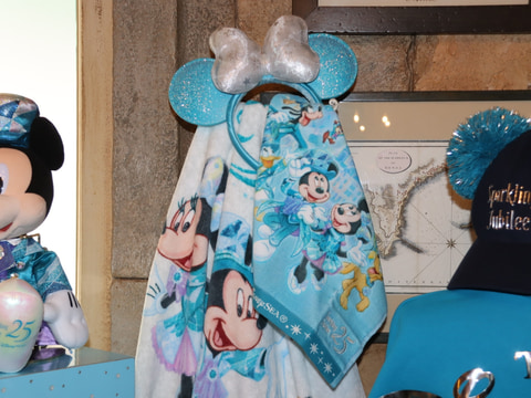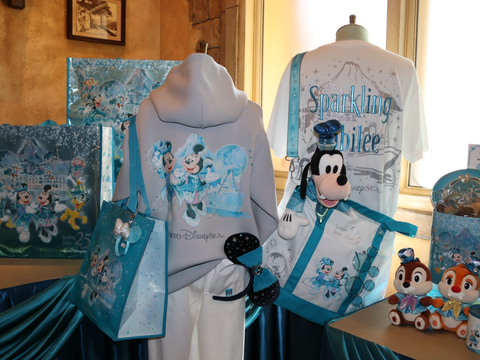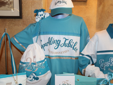 今回展開されるのは、東京ディズニーシーの開園25周年を記念したグッズ。シンボルカラーのジュビリーブルーに染まるアクアスフィアやプロメテウス火山など、東京ディズニーシーのアイコンと一緒にディズニーのキャラクターたちがデザインされたグッズが販売される。