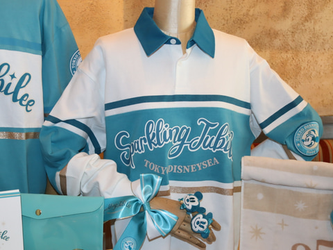 ぬいぐるみバッジやフラッグには、エンターテイメントプログラム「スパークリング・ジュビリー・セレブレーション」に出演するディズニーキャラクターたちが、ジュビリーブルーを基調とした衣装を着た姿でデザイン。その他にも、Tシャツ、ポロシャツ、キャップ、ショルダーバッグなども用意されている。