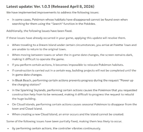 ポケモンは、Nintendo Switch 2用スローライフ・サンドボックス「ぽこ あ ポケモン」の更新データ(Ver.1.0.3)を4月9日に配信開始した。