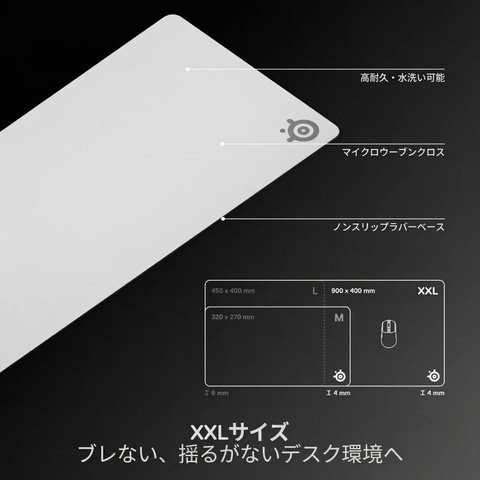 Lサイズは厚さ6mm、XXLサイズは厚さ4mmという極厚仕様により、より一層高い安定感を実感できる。また、背面にはノンスリップラバーベースを採用。しっかりと固定されるため、激しいマウス操作にも対応する。
