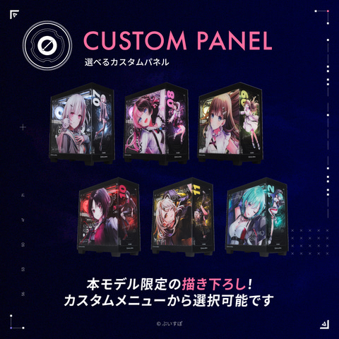 今回刷新された「ぶいすぽっ!コラボモデル」のデスクトップは、サイドとフロントに強化ガラスを用いたピラーレスデザインを採用。描き下ろしイラストが目を引くケースが完成した。イラストは、全員が揃ったバージョン、もしくは各メンバーが描かれたバージョンがあり、好きなメンバーのデザインを選択できる。さらに、メンバーごとにLEDカラーを設定し、ロゴ入り水冷クーラーを実装して発送される。