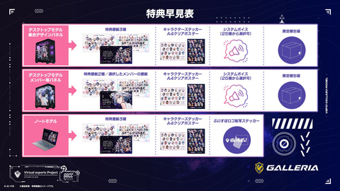 また、購入特典として、キャラクターがデザインされたステッカー、A4クリアポスターのほか、メンバー全員が集合したデザインの壁紙3種をインストール済み。デスクトップで個別メンバーのカスタムパネルをオーダーした場合は、集合デザイン2種と、メンバーに応じてデザインされた壁紙が1種という組み合わせとなる。さらにデスクトップでは、好きなメンバーのシステムボイスを選択でき、オリジナルの梱包箱で届けられる。