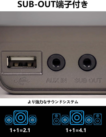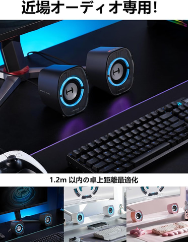本製品は、コンパクトな小型デザインながら高音質を実現するゲーミングスピーカー。Subout端子を搭載し、サブウーファーと接続することで、2.1/4.1/7.1 サラウンドシステムを構築でき、臨場感あふれる重低音を実現する。フルカラーRGB ライトを搭載し、Bluetooth/USB/AUX 接続に対応。PCやPS5・Switchなど各種ゲーム機に対応し、ゲーム・映画・音楽のEQモードでシーンに合わせたサウンドを楽しめる。