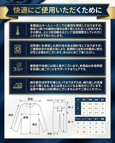 本商品は、日々のハードワークで身体を酷使する人のための「ケアウェア」。独自開発の高機能繊維が体温を効率よく吸収し、遠赤外線として再輻射。じんわりと血行促進をサポートし、身体を芯から温めることで、質の高い休息環境を整える。衣服内の熱がこもりすぎるのを防ぐため、夏はさらりと、冬は冷えから守り、オールシーズン快適な着心地をキープする。