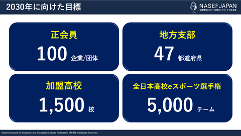 また、2030年に向けた目標も公表。正会員数は100企業/団体、地方支部は47都道府県、加盟高校は1,500校、全日本高校eスポーツ選手権は5,000チームを目指していくとしている。現在、プレス向けの発表会が開催されており、詳細は別途掲載予定だ。