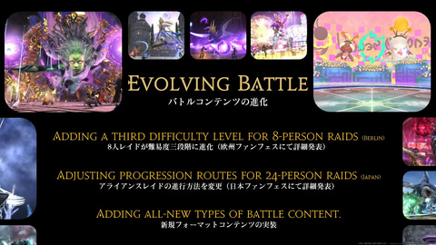 そして8人レイドにも通常難易度と零式の「中間の難易度」を追加する。どう遊んでも装備が成長するシステムを目指すとしている。アライアンスレイドに関しては進行方法を変え、所要時間を見直す。詳細については欧州ファンフェス移行で発表される予定。