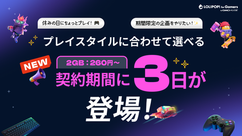 GMOペパボのゲーム用マルチプレイサーバー「ロリポップ! for Gamers」では、4月27日より最短3日間からの契約が可能となる。