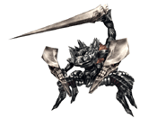 巨大な尾針が目を引くサソリの騎士。尻尾を振り回す広範囲への攻撃や、素早い動きからのジャンプ攻撃など、多彩な動きと堅牢な両腕の盾での防御を駆使した戦いを挑んでくる。重心が上にあるため、攻撃も尻尾や頭部をねらった正確なアクションが要求される。足元にもぐりこんでの斬撃でダウンを狙うことができるが、視界の悪い状況下で常に敵の動きを把握しておかなければ、深刻な反撃を受けてしまう。