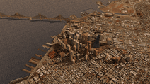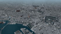 | パノラマグラフィックの各マップは、PSPの描画限界に挑む美しさ。現実世界で見たことがある風景だけに、「空から見たあの都市」の観光気分を味わうこともできるという。もちろんビルの谷間、橋の下、曲がりくねった渓谷などの建造物をすり抜けるような、アクロバティックな飛行を楽しむこともできる | |