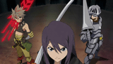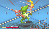 | 小牟が鬼門封じで敵を止め、零児が火燐と霜麟の二刀で左右連続突きを仕掛ける。最後に小牟がジャンプからのヒザ蹴り「小牟ウィザード」を決める攻撃「有栖流・閃珠神音&小牟魔術」 | |