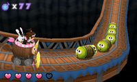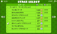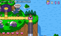 | 物語はワールドマップに沿って進行するが、1度クリアしたワールドは、ステージセレクト画面からもステージを選べるようになる。高得点を取ったステージは、ここからスピードモードに挑戦できるようになる | |