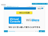 Wii用ソフトはそのまま利用可能。Wii UをWiiモードに切り替えて起動する。WiiにダウンロードしたバーチャルコンソールやWiiウェア、追加コンテンツ等は、Wii Uに引っ越し手続きをすることで使用できる。