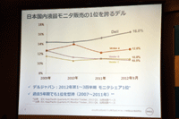 デルといえばかつてはPCメーカーだったが、現在は、PC、サーバーはもちろんのこと、それらにマッチする最適な周辺機器まで含めたトータルなコンピューティングソリューションを提供するメーカーになっている。とりわけ、年々事業的に大きな存在となっているのがモニターで、2012年は(2012年第1四半期〜第三四半期まで)は国内でトップシェアを維持している。