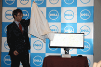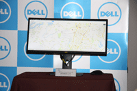 発表会後半では、新製品の説明が行なわれた。29インチウルトラワイド液晶モニター「U2913WM」の説明では、デルの河田浩行氏による除幕式があり、幕を取り払うと2,560×1,080ドットの領域にGoogleマップを広々と表示した「U2913WM」が出現した。