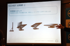 23インチマルチタッチモニター「S2340T」は、Windows 8で標準対応しているタッチインターフェイス向けの10点マルチタッチモニターで、通常の液晶モニターのように立てて設置する標準的な置き方から、タッチパネル式の案内板のように角度を付けておいたり、地図を広げてみるように地面にフラットに置くこともできるという多関節スタンドが特徴となる。