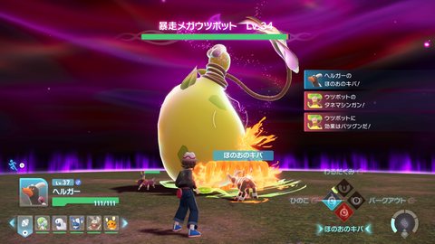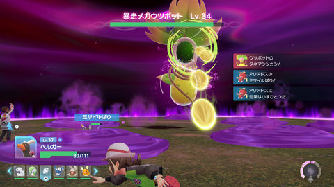 今回戦った「メガウツボット」はフィールドに毒エリアを生み出し、その上にいるトレーナーとポケモンにダメージを与えてくるのが大きな特徴だ。そのうえで直接主人公を狙って遠距離攻撃を行ったり、自身の周囲に範囲攻撃を行うため、攻撃の隙を見つけるのが難しい相手となっていた。