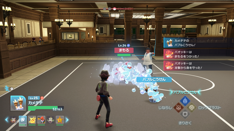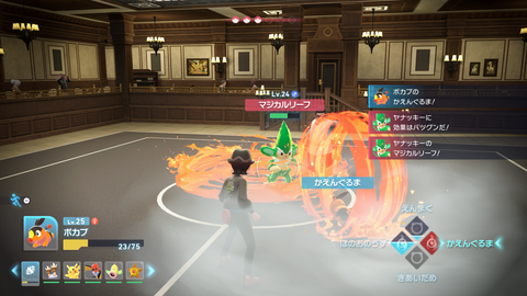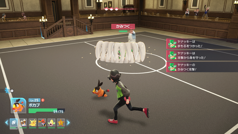 トレーナー戦も戦闘システムは野生と同じアクションバトルだが、野生のポケモンとの戦闘とは異なり、相手も連続でポケモンを繰り出してきたり、弱点をしっかり突いてきたりするため、トレーナー戦ならではの立ち回りが重要になる。