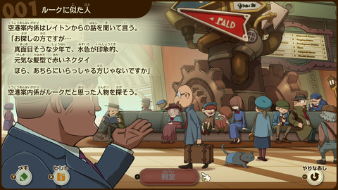 今回の体験ではレイトン教授とともにいくつかのナゾ解きに挑戦することができた。最初は言葉遊びのようなものから、プレーヤーが調べて実際に違和感を見つけるナゾ、プレーヤーの発想力を試すものといったバラエティに富んだナゾが用意されている。