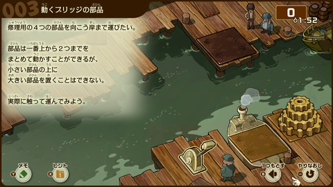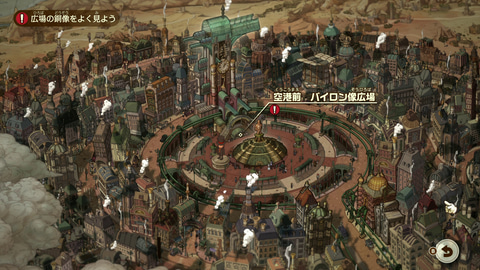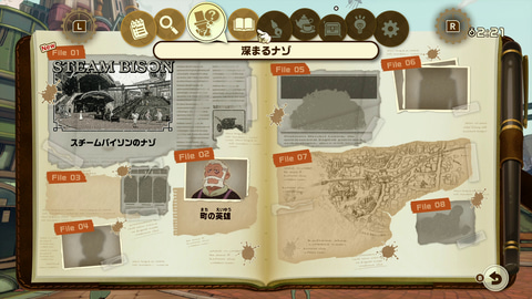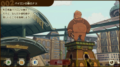 ナゾを解いていくと移動できる範囲が徐々に広がり、新しいナゾにも挑戦できるようになる。スチームバイソンの街の中もいろいろ見て回ることができる。