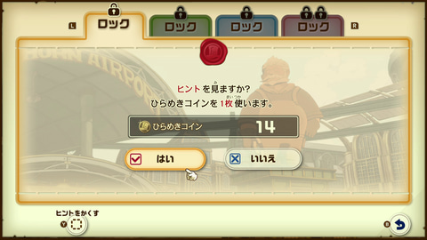 しかし、苦手なジャンルのナゾが来ても悲観的になる必要はなく、ヒントをうまく使えば簡単に解けることもある。ヒントはシリーズおなじみの「ひらめきコイン」というアイテムを消費して見ることができる。ヒントを見ても解くのが難しいナゾもあるが、今回体験したナゾは頑張れば解けそうという難易度のものが多く、だか解きごたえはしっかりあるナゾになっていると感じた。