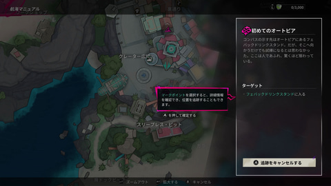 こうした部分も含めて、ゲーム序盤は移動や戦闘などの基本が学べるチュートリアル的な内容が含まれている。何をやればいいのかその都度細かくアナウンスが表示されるため、非常にわかりやすい。目的地も地図で確認できるほか、移動中に目指すべき方角が表示されるので複雑な地形でもない限りあまり迷うことはないだろう。