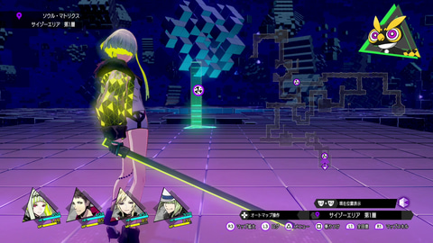 ダンジョン内にいるのはもちろん仲魔だけではなく、敵悪魔も徘徊している。今作ではシンボルエンカウント形式となっており、フィールド上でエネミーシンボルに攻撃を当て、ダウンしたところを接触することで先制やバトル開始時にダメージを与えるボーナスアタックが発動。戦いを有利に運ぶことができる。