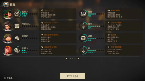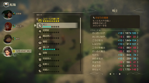 固有職以外の「基本職」は誰でもつくことができ、選んだ職業ごとにパラメータが変化するほか、戦闘勝利時に得られる「職業熟練度」によって「職業ランク」が上がり、呪文や特技を身に着けていく仕組みだ。また全ての職業には「職業とくせい」なる固有能力が用意されており、戦闘中の「バースト」発動時にその効果を発揮し、バトルを有利に進められるようになっている。