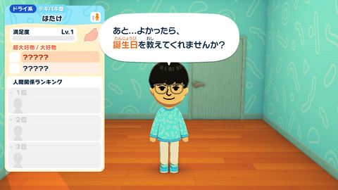 ちなみにDS時代のトモコレは、例として最初に「はたけ(筆者のハンドルネーム)」というMiiを作ると、プレーヤーは自動的に「はたけのそっくりさん」と呼ばれるようになっていた。