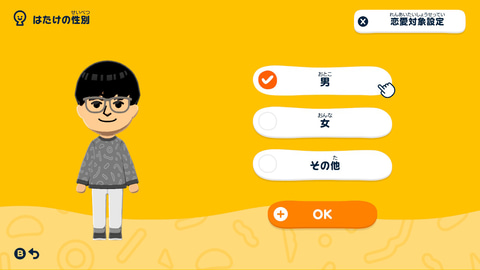 本作からMiiを作る時のパーツに「フェイスペイント」が加わり、Miiたちの顔にアクセントを足したり、一からMiiの顔を作れるようになった。さらに性別が男・女・その他の3種類となり、恋愛対象の性別も設定できるようになったことで、性別未詳のマスコットキャラクターや宇宙人的なMiiを作りやすくなっている。オリジナリティを出して、より“そのMiiらしさ”を追求できるようになったのは嬉しいポイントだ。