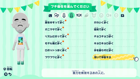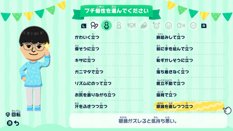 そして、さらに“そのMiiらしさ”を引き立てるのが、本作からの新要素「プチ個性」。その名の通り、Miiたちにちょっとした個性を授けるもので、例えば挨拶や立ち方、歩き方、食べ方において特徴的な仕草をするようになる。メガネっ子には「眼鏡を直しつつ立つ」、宇宙人には「浮いて移動する」など、そのMiiに合った「プチ個性」を渡そう。