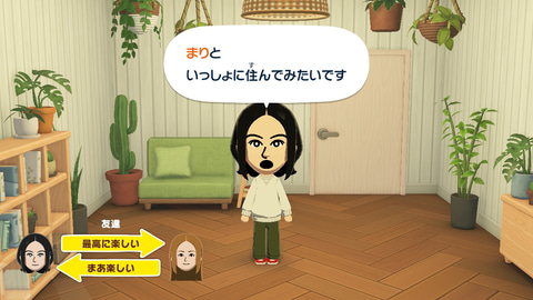 例えば、Mii同士で友達になってほしい時は、一方のMiiをつまんでもう一方のMiiの元へ連れていくことができる。管理人がおせっかいを焼けば焼くほど、Miiたちの仲が変化していくのだ。Miiたちの関係性をそばで見られるのは、まるでドラマのようで非常に面白い。