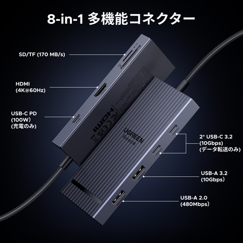 UGREEN Revodok Pro USB-C ハブ Type-c 8-in-1 100W PD急速充電 10Gbps高速データ転送 HDMI出力 4K@60Hz 2*USB A/C microSD&SDカードスロット搭載 MacBook Pro/Air/iPad Pro/XPS/Thinkpadなどに対応