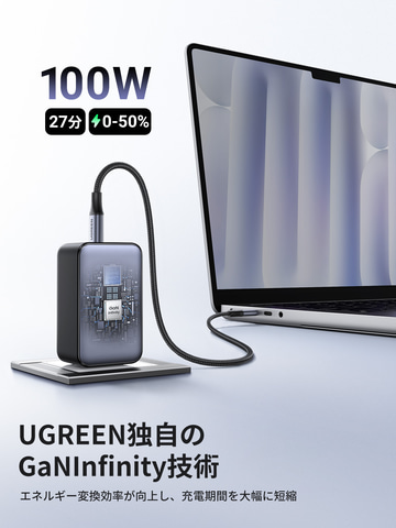 本製品は、100W急速充電器としては最小級のサイズを実現した100W超小型急速充電器。iPhone 15 Proの場合、わずか30分で0%から60%まで充電可能なほか、MacBook Pro 14の場合は0%から50%の充電がわずか27分という速さになっている。