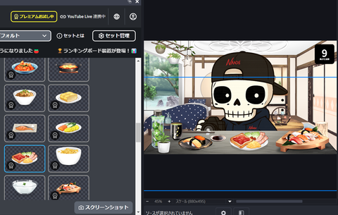 フリープランとプレミアムプランの違いについては、もう少し付け加えておきたい。プレミアムプランに入ればカスタマイズの幅はより広がるが、結論から言えば、動画配信画面の見栄えを整える目的ならフリープランで十分である。背景イラストやフレーム、小物、効果音など、画面づくりに必要な素材がほとんど無料で取り揃えられているからだ。フリープランだけでも「素材探し」の苦行から解放されるのは、最大のメリットだろう。これだけで動画配信における最初のハードルが大きく下がったようなものだ。