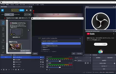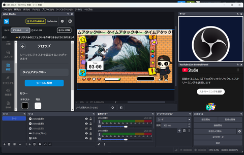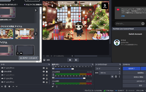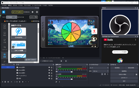 まずは配信画面を組み立てていく。「Alive Studio byGMOペパボ」と正しく連携できていれば、OBSのソースにあらかじめアセットの組み合わせがプリセットとして挿入されている。このソース内にあるアセットを、カスタムブラウザドックの中から選択して入れ替えたり、表示する順番を変えたりすることで、配信画面の細かな構築が行える。また、ソースを選択し、画面プレビュー内のドラッグでアセット位置調整も可能となっている。