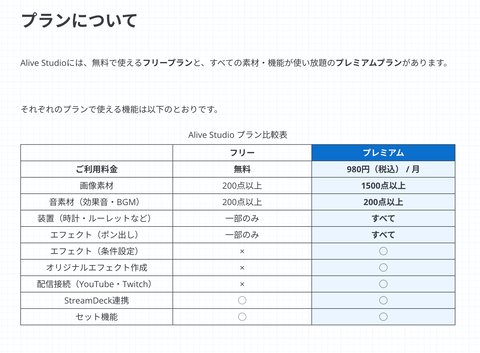 「Alive Studio byGMOペパボ」はフリープランでもそれなりのアセット数と基本機能をカバーしている。公式サイトでプランの比較表を見ても、「ここまで使わせてくれるの?」と驚くほかない。趣味の範囲で細々と配信しているユーザーには十分過ぎる機能性だ。何より動画配信デビューの課題となる「配信画面用の素材」がほとんど無料で揃ってしまうのだから、「これから配信デビューしたい」と思っているのであれば、使わないのは損だろう。