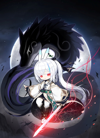 うさ耳+赤い目+東洋風衣装+梅の花=嫌いな人などいない、万人に愛されるキャラです。青い輝きを帯びたウサギの耳(東洋風デザインのピアスがポイント)と少しうつむいているような印象の赤い目、どこか寂しそうで儚げな雰囲気が魅力的です。