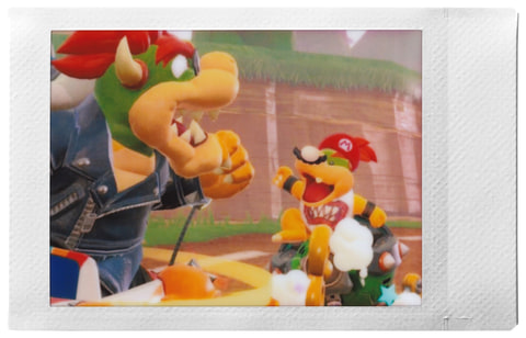 あたかもライバルの仮装をしたクッパJr.に対して、クッパが何か抗議しているような構図の「キャラチェキ™︎」が仕上がった。マリオの影響をクッパJr.が受けたのかもしれないし、レース中のイタズラでクッパに見せつけに来たのかもしれない。スタンプを加える前も好きなスクリーンショットだったが、スタンプひとつで別のストーリーや解釈が生まれてきた。このように付加価値が生み出せるからこそ、デコレーションというものは面白い。