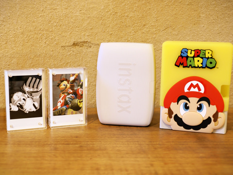 「instax™︎ miniフォトフレーム」は、中の台紙にチェキを貼り付けて、3枚並べて飾れるアクセサリーだ。台紙はアクリルパネル2枚に挟み込まれた形となる。台紙を抜いて反対側のパネルにチェキプリント™︎を貼り付ければ、スケルトン風の展示も可能。また、細い紐をフレームの金具に通すことで壁掛けもできるのがポイントだ。ちなみに、mini Link 3 で使えるシリコンケースも、インテリア単体として映える。ここで紹介したアクセサリーと一緒に飾れば、大好きなゲームの世界を感じられる空間を簡単に演出できる。