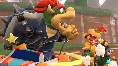 使用したスクリーンショットは、クッパとクッパJr.の親子がレース中に何か言い合っている……といったシチュエーションを意識した。そこに「Sticker」で、マリオの帽子、マリオの鼻と髭をクッパJr.に加える。ライバルであるはずの“マリオの仮装をしたクッパJr.”の出来上がりである。
