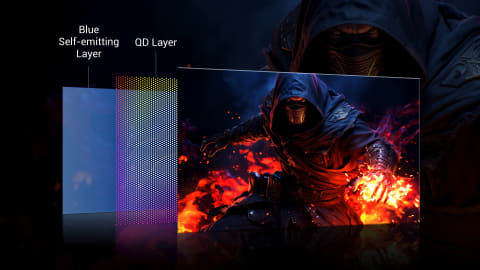 ゲーム画面の紹介に移る前に「完全な黒」を生み出す量子ドット有機EL(QD-OLED)の仕組みについて簡単に説明しておこう。