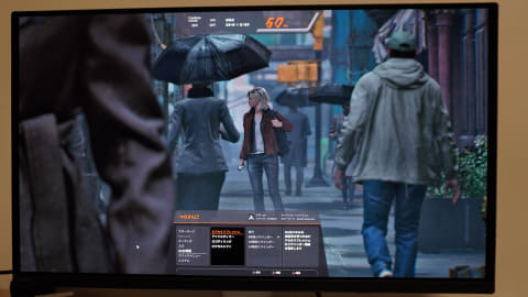 OSDメニューから実際に「Smart Game Art」モードを試してみたところ、「バイオハザード レクイエム」はリアリスティックモードに近い色味になった。比較してみると、プリセットのリアリスティックモードよりも少し黒が引き上げられ、グレースが背負っているバックパックの細部や、背後にいる女性のコートなどがより視認しやすくなっているのがわかる。