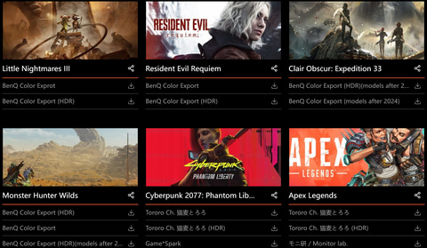 「MOBIUZカラーセンター」は「DEATH STRANDING 2: ON THE BEACH」や「サイレントヒルf」、「Ghost of Yotei」、「Clair Obscur: Expedition 33」など多くのゲームに最適化したカラープロファイルをダウンロードできるBenQのサービスだ。こちらに対応タイトルがある場合はダウンロードしたカラープロファイルを「Color Shuttle」で読み込ませることで、それぞれのゲームに最適な設定を簡単に実現することもできる。なお、「バイオハザード レクイエム」は表記名「Resident Evil Requiem」でプロファイルが用意されており、ぜひこちらを使用していただくといいだろう。