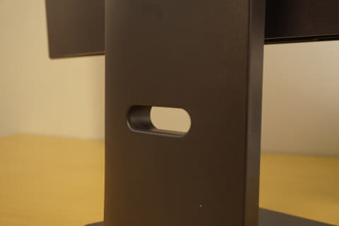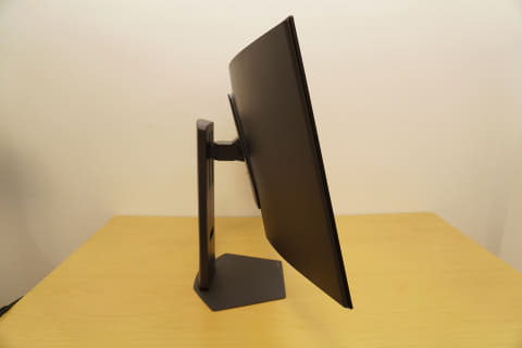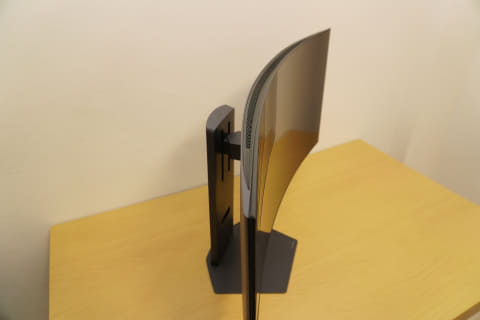 ディスプレイのサイズが大きいので、スタンドは台も支柱もかなりしっかりした作り。一人でも設置は可能だが、2人で作業した方が安定しそうだ。支柱はスイーベルとティルトに対応しており、高さも10cm程度変えることができる。