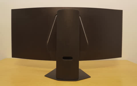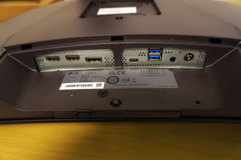 背後には、下向きにHDMIポートが2基、DisplayPort 2.1が1基、90WのPDに対応したUSB Type-Cと、イヤホンジャックが並んでいる。このエリアを隠すためのプラスチックのパーツが付属しており、接続後にはめ込めば背面をスッキリさせることができる。